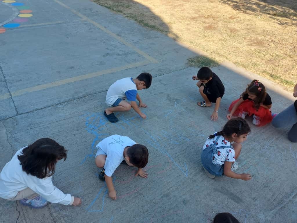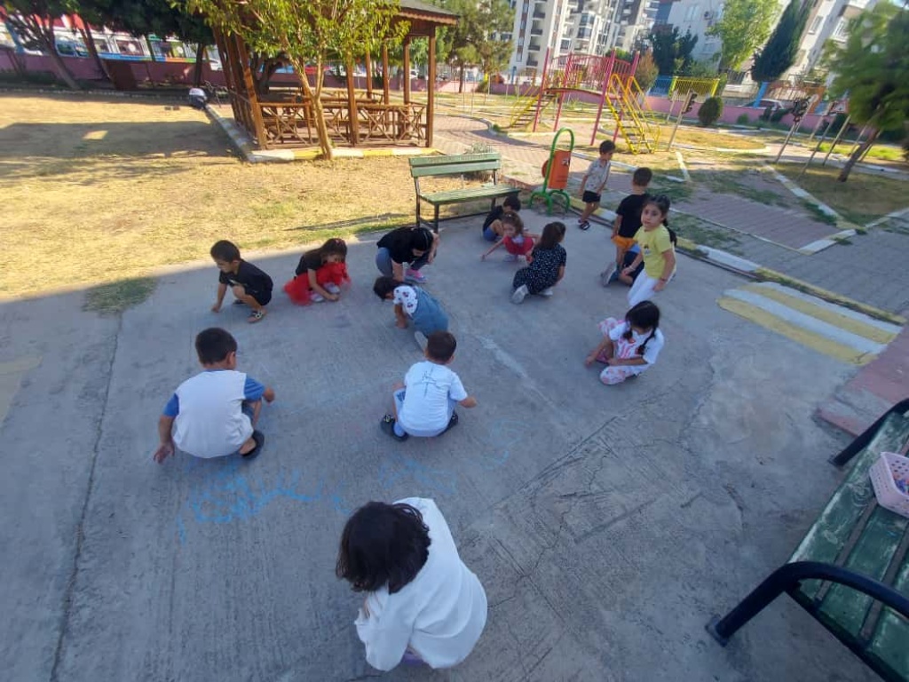 5 yaş Minik Kalpler öğle grubu bahçede tebeşirlerie 1 rakamı çalışması yapıp, Mavi renk kavramı öğrendiler